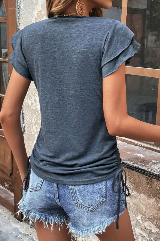 Gray Ruffle Short Sleeves V Neck Drawstring Top