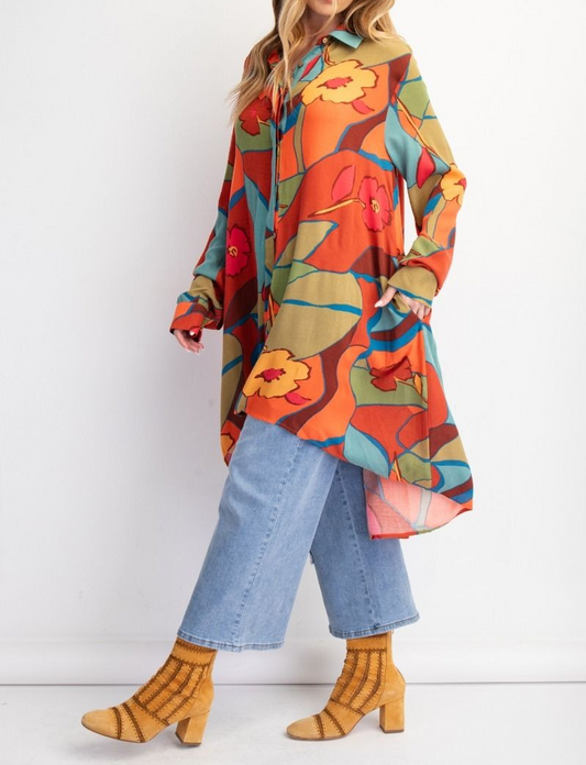 PRINTED RAYON CHALLIS BUTTON DOWN SHIRT DRESS